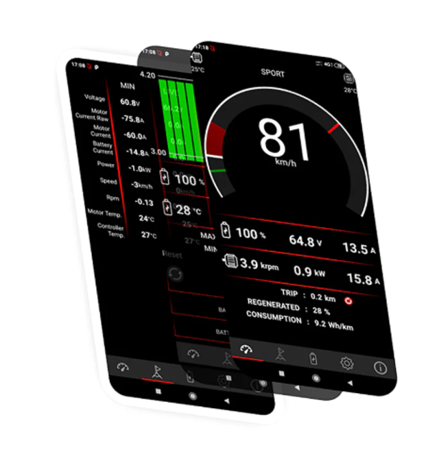 - - Caractéristiques : application mobile (IOS et Android), écran Sur-Ron d'origine