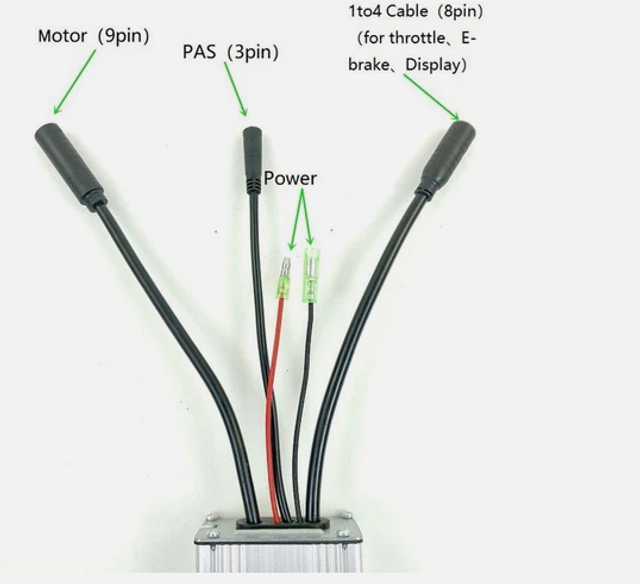 Connecteurs: moteur (9 broches étanche)、puissance (rouge-noir)、PAS (3 broches étanche)、câble 1T4 (8 broches pour accélérateur,Display,Ebrake)