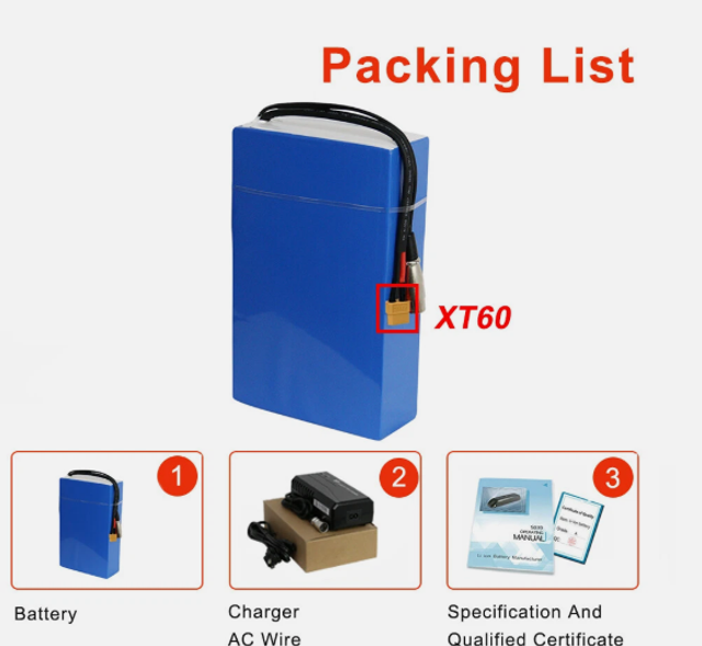 Batterie 48V 20Ah 50A Tension : 48 V Capacité de la batterie : 20Ah Spécification de la cellule : G25 8A 3C chinoise 2500mah 3.7V Power Cells Configuration : 13Series 8Paralles = 104pcs cellules Taille de la batterie : 252*162*70mm Poids : 5,3 kg (11,7 lb) Courant de charge standard : 3A Courant de charge continu maximal : 5A Courant de décharge continu maximal : 50A Courant de décharge de pointe : 150A Pour le moteur : 48 V 750 W / 1000 W / 1200 W / 1500 W / 1800 W Chargeur d’entrée : AC 100-240V Tension d’arrêt de charge : 54,6V Tension d’arrêt de décharge : 36,4V Chargeur : 54,6V 3A Décharge : XT60
