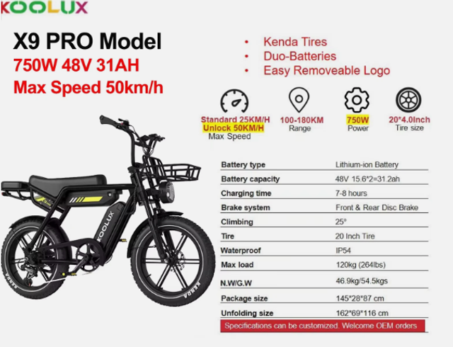 Affrontez tous les terrains avec puissance et style grâce au X9 Pro, un vélo électrique fat bike 750W conçu pour les aventuriers urbains et les amateurs d’outdoor. Avec sa batterie longue autonomie de 30Ah, ses freins hydrauliques, ses pneus 20" extra larges,